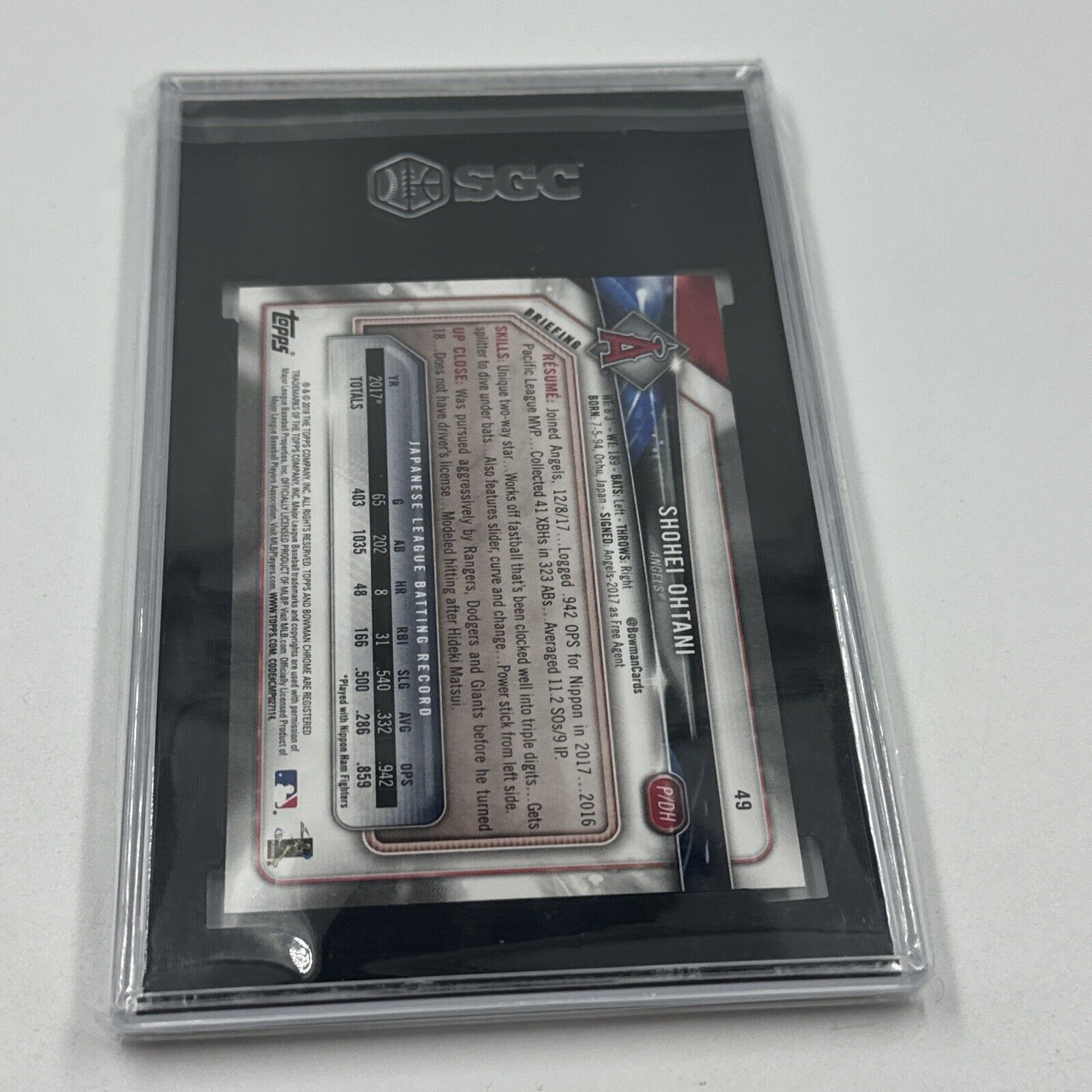 2018 Bowman #49 Shohei Ohtani Rookie RC SGC 9.5 MINT