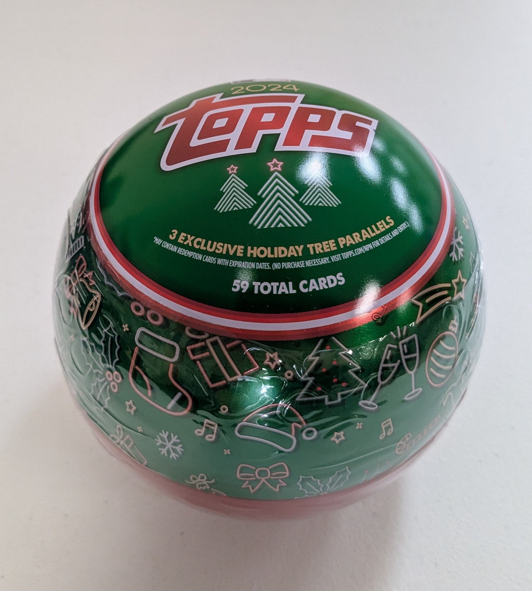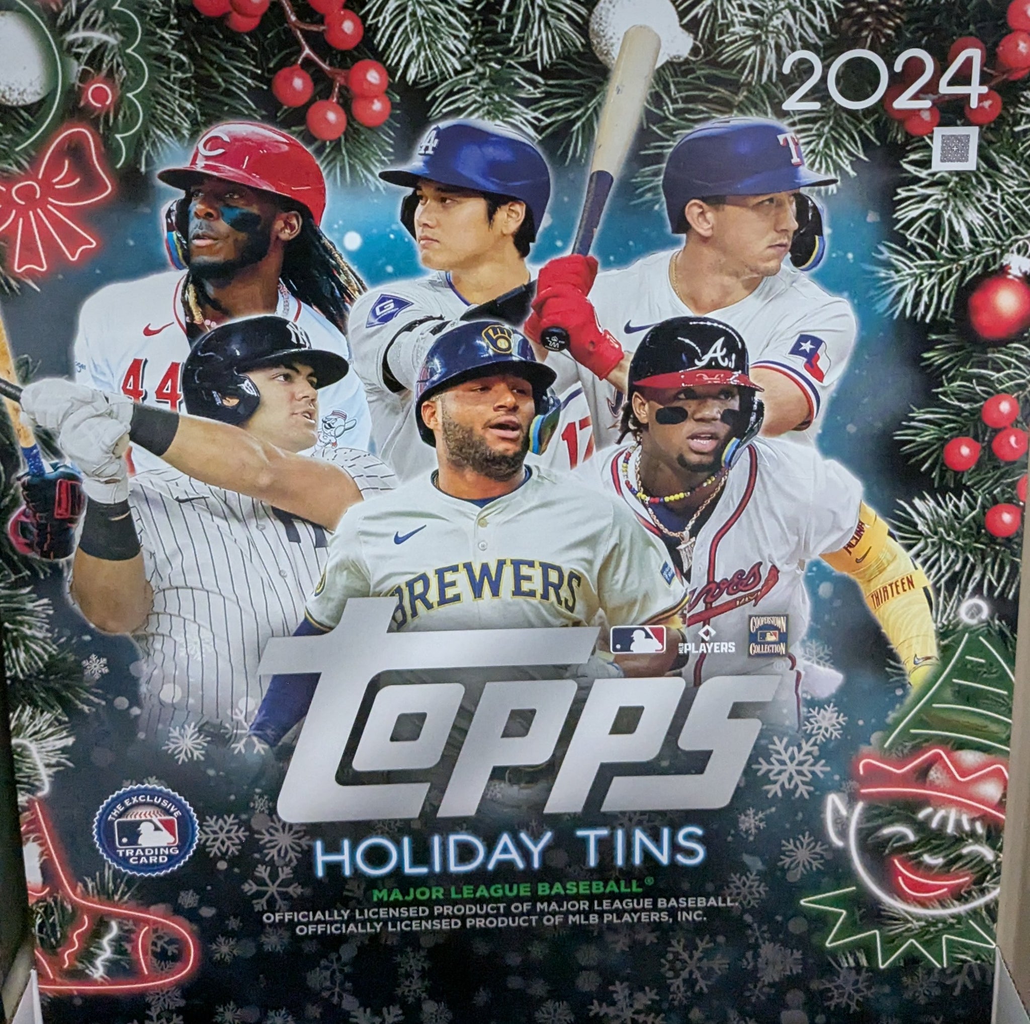 Each Tin contains fifty-nine (59) 2024 Topps Holiday Baseball cards including fifty four (54) base cards, one (1) short print holiday image variation, one (1) blue metallic holiday tree parallel and three (3) holiday tree border parallels.