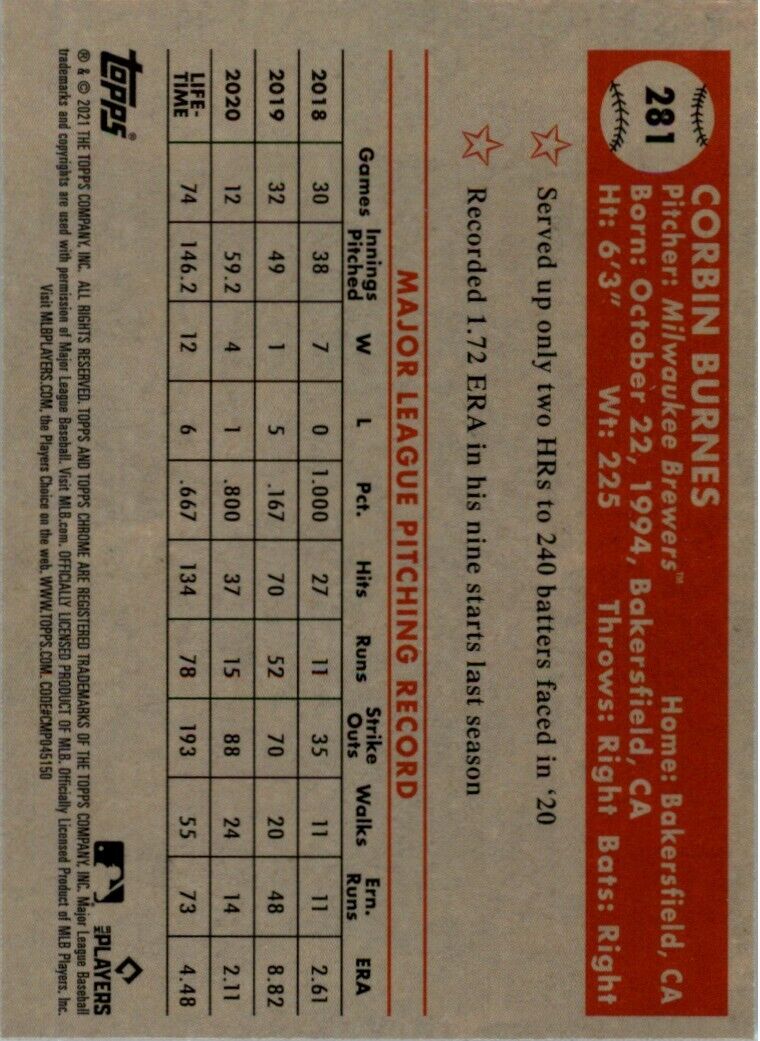| 2021 Topps Chrome Platinum Anniversary 281 Corbin Burnes |